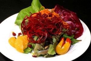 • Asian salad w/carrot-ginger dressing (baby romaine, baby bok choy, sugar snap peas,mung bean sprouts, fresh basil and cilantro)